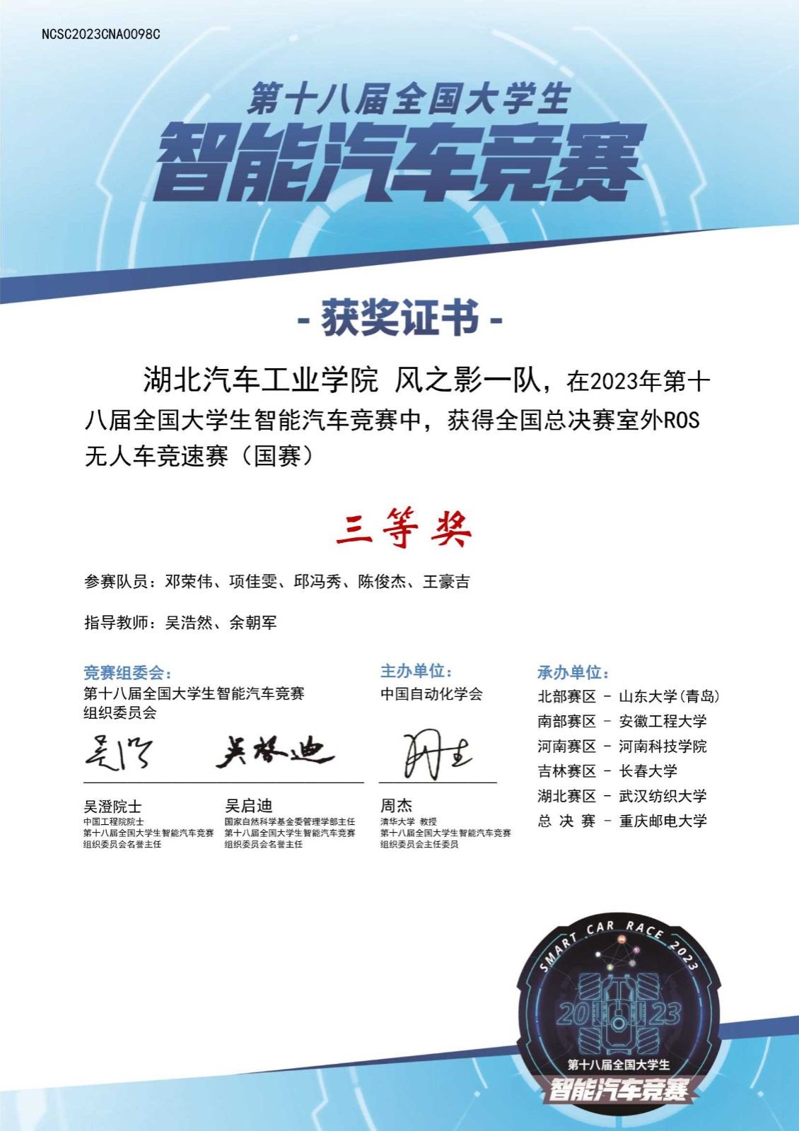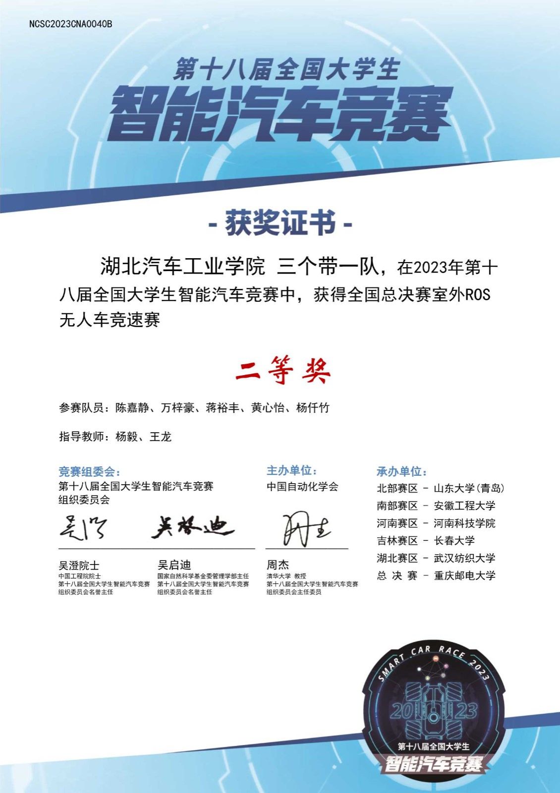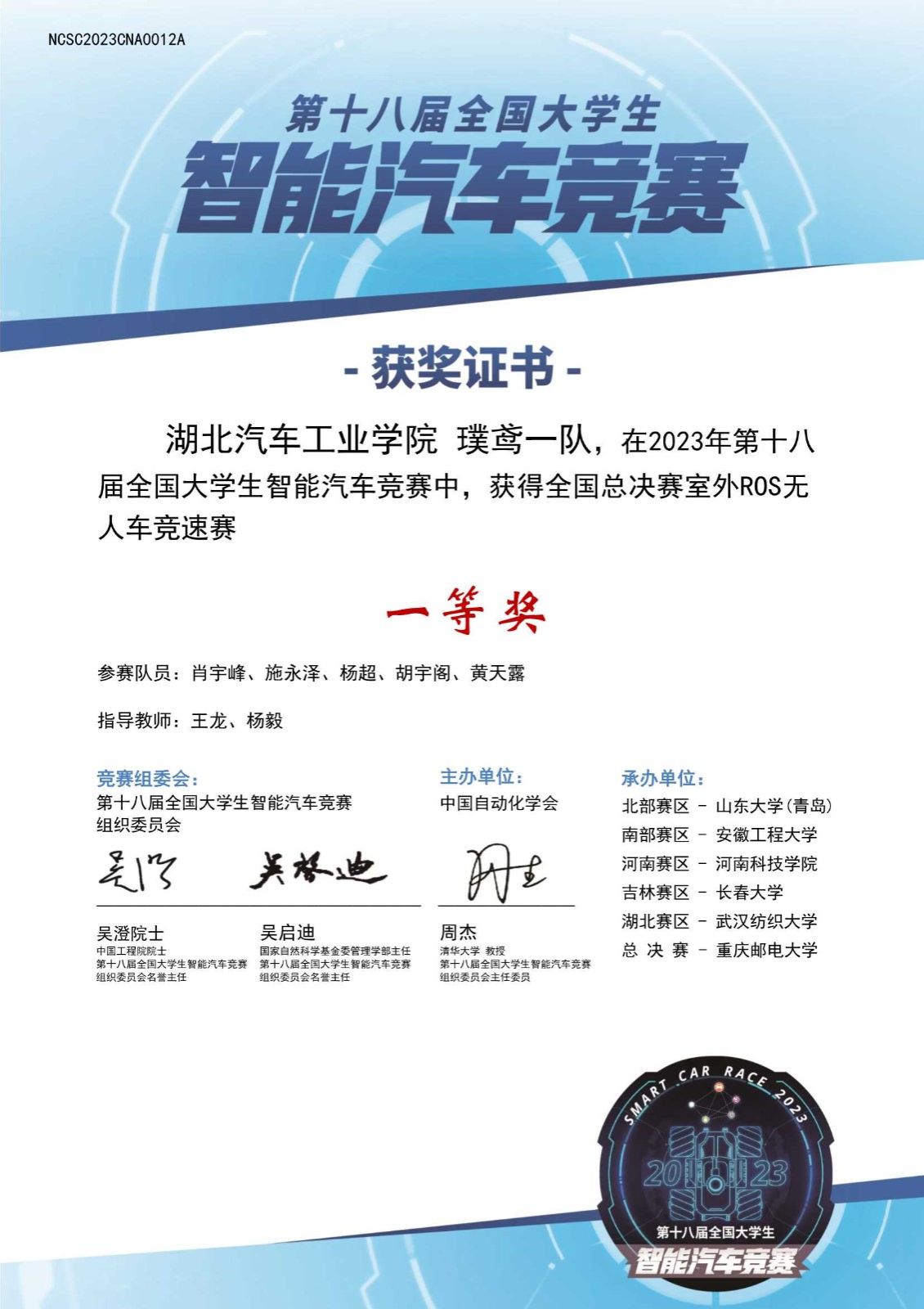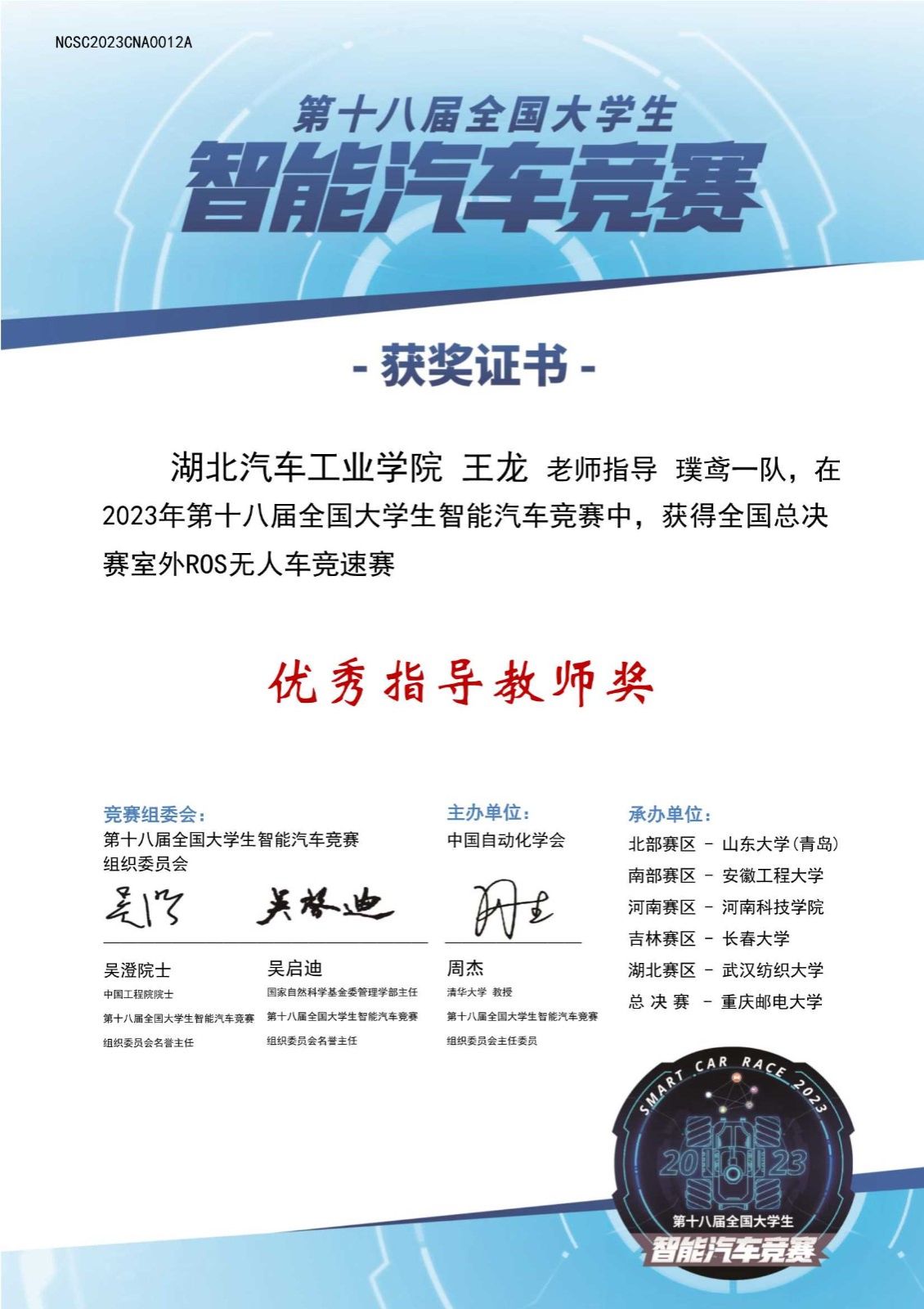 本网讯(文/图 王龙、吴浩然)近日,由中国自动化学会主办,中国自动化学会智慧教育专业委员会、重庆邮电大学承办的第18届全国老员工智能汽车竞赛室外专项赛总决赛落下帷幕。公司由电气与信息工程公司选派的2支参赛队伍“璞鸢一队”“三个带一队”和汽车工程公司选派的1支参赛队伍“风之影一队”从省赛中突破重围进入全国总决赛。在全国总决赛上电气与信息工程公司参赛队伍斩获全国一等奖一项、全国二等奖一项,汽车工程公司参赛队伍斩获全国三等奖一项。王龙被评为优秀指导教师。